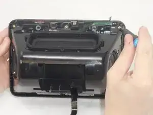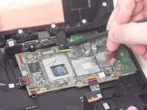 Используйте заострённый конец лопатки, чтобы поднять оба фиксирующих язычка ZIF. Аккуратно вытяните оба кабеля из их разъёмов.