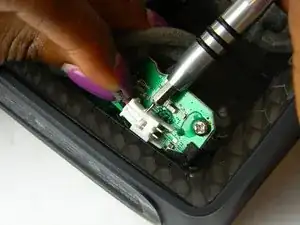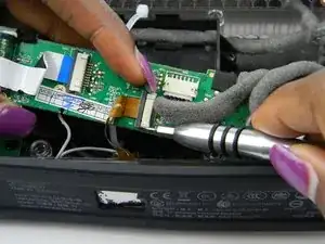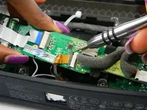 Используйте насадку отвертки 0.8, чтобы нажать на защёлки, удерживающие этот кабель.