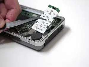 Подденьте клавиатуру с левой стороны и используйте пинцет, чтобы сдвинуть её влево и вынуть.