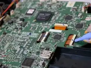 Чтобы отсоединить ленточные кабели, подденьте фиксирующую пластину на разъёме инструментом для открытия и сдвиньте кабель назад и выньте из разъёма.