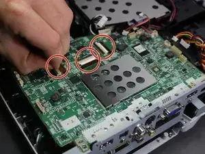С помощью лопатки или ногтей приподнимите чёрные фиксирующие язычки и отключите три ленточных кабеля от материнской платы.