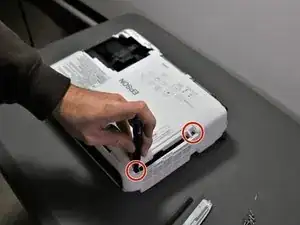 Той же отверткой Phillips №1 выверните два винта длиной 10 мм в том месте на верхней стороне проектора, где в шаге 1 была снята белая панель.