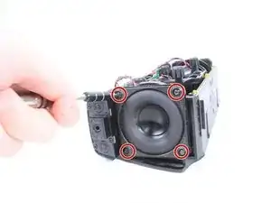 Используя отвёртку T9, снимите 8 винтов (по 4 на каждый динамик), окружающих среднебасовые динамики.
