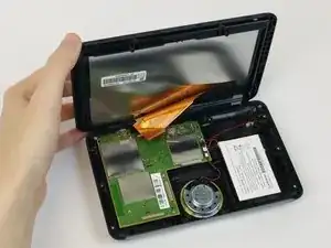 Поднимите экран с противоположной стороны, где находится логотип "GARMIN". Удалите прозрачную ленту, удерживающую шлейф на материнской плате.