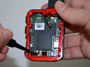 Той же парой пинцета аккуратно потяните тонкую красную полоску в сторону края корпуса, чтобы отсоединить её от материнской платы.