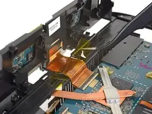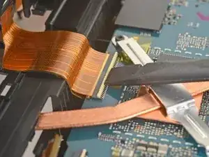 Используйте острый конец лопатки, чтобы отогнуть маленькую фиксирующую планку ZIF-разъёма правого кабеля камеры.