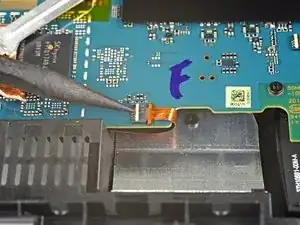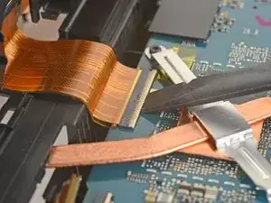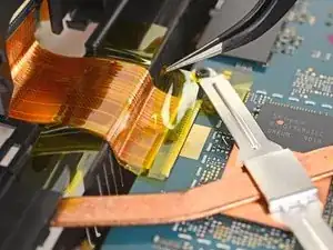 Отогните ленту, закрывающую кабель соединения с дочерней платой, достаточно далеко, чтобы получить доступ к разъёму кабеля.