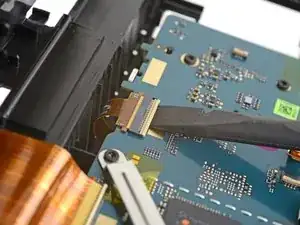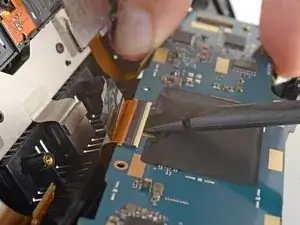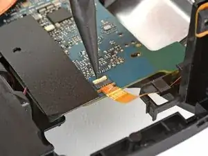 Используйте острый конец лопатки, чтобы отогнуть маленькую фиксирующую планку ZIF-разъёма левого кабеля камеры.