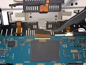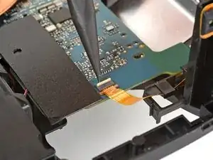 Используйте острый конец лопатки, чтобы откинуть маленький фиксирующий язычок, удерживающий ZIF‑разъём кабеля микрофона.