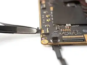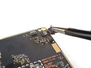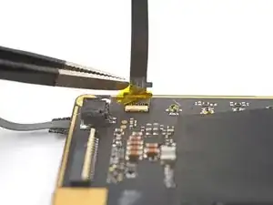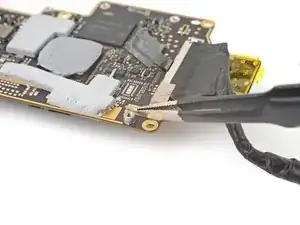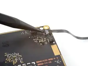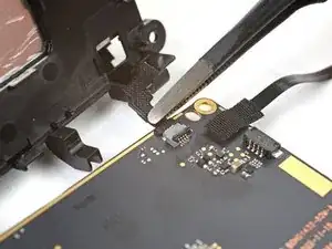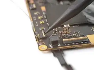 Используйте пинцет, чтобы извлечь кабель кнопки громкости из его паза на материнской плате.