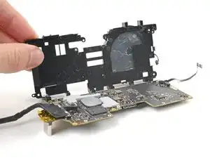 Используйте отвертку с битой Torx T5, чтобы вывернуть один винт длиной 3,5 мм, крепящий рамку материнской платы.