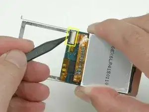 Используйте лопатку для отсоединения кабеля разъёма для наушников от материнской платы. Аккуратно подденьте разъём в сторону (или вверх, если удобнее) передней части iPod, пока он не отсоединится от материнской платы. Разъём похож на соединение деталей LEGO®.