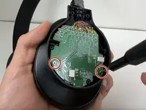 Используйте отвертку Tri-point Y0, чтобы удалить два винта 5 мм у основания оголовья, где оно соединяется с чашкой наушника.