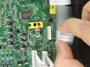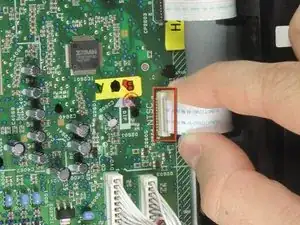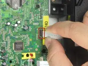 Отсоедините второй из трёх шлейфов слева от дисковода, потянув вертикально.