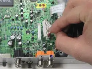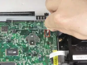 Отсоедините второй из двух многоконтактных кабелей, подключённых к левой материнской плате (зелёной), потянув вертикально.