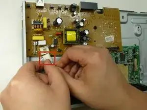 Отсоедините кабель питания от коричневой материнской платы, нажав на фиксатор на разъёме и вытянув его.