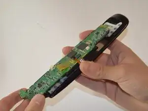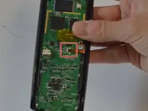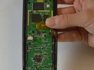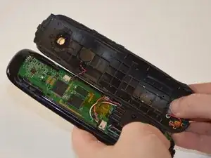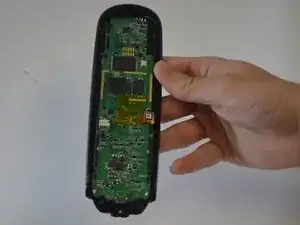 Снятие тёмной пластиковой детали с материнской платы требует терпения, так как пульт спроектирован так, чтобы батарея не сдвигалась при экстремальных условиях. Небольшая плата с USB-портом остаётся подключённой к материнской плате шестью штырями длиной 10 мм.