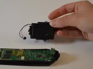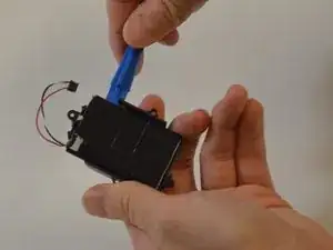 Батарея по-прежнему подключена к устройству проводами. Чтобы полностью освободить батарею, извлеките тёмную пластиковую деталь из паза с помощью пластикового инструмента для вскрытия. Медленно поворачивайте тёмную пластиковую деталь вместе с батареей по часовой стрелке, пока они не будут извлечены из-под небольшой печатной платы с USB-портом.