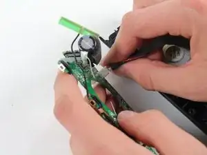 С помощью паяльника распаяйте два конца контактной пластины переключателя. Сначала распаяйте два контакта со стороны разъёма на наушники, так как средний контакт имеет выемку и должен быть извлечён, когда припой расплавится.