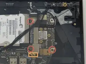 Используйте отвертку Torx TR6, чтобы удалить три винта длиной 5 мм, крепящих материнскую плату.
