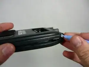 Найдите коричневый последовательный разъём на левой стороне устройства. Используя биту плоской отвертки, отодвиньте маленькие защёлки (по одной с каждой стороны) наружу в вашу сторону, как показано на фото.