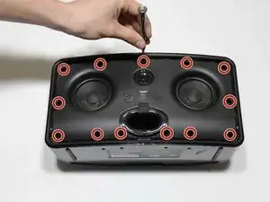 Используйте крестовую отвертку #1, чтобы удалить тринадцать винтов длиной 12 мм в корпусе динамика.