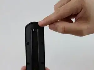Переверните пульт так, чтобы показать его заднюю часть, и поместите указательный палец в отстой. Нажмите осторожно, чтобы открыть крышку батарейного отсека.