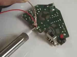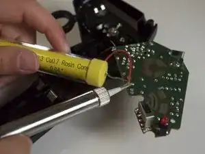 Замените материнскую плату. Припаяйте провода обратно к новой материнской плате, используя набор для пайки. Черный провод должен быть слева, а красный провод — справа.