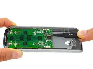 Вставьте пластиковый инструмент для вскрытия в зазор между чёрной верхней крышкой и серебристой основой по нижнему краю пульта.