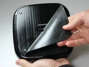 Начиная с одного угла устройства, осторожно оттяните резиновую наклейку назад в сторону противоположного угла, чтобы открыть лежащие под ней винты.