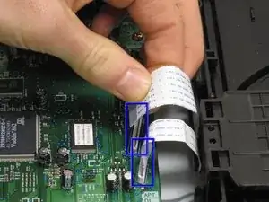 Снимите два плоских шлейфа, расположенные рядом с дисководом и блоком питания в верхнем левом углу платы (при ориентации дисковода справа), прежде чем пытаться вынуть основную плату.