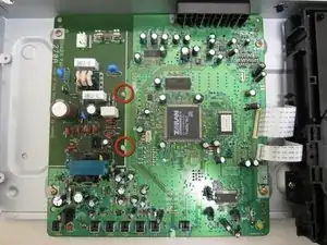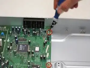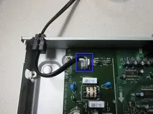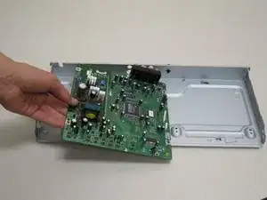 После сжатия защёлок аккуратно приподнимите основную плату из её посадочного места в корпусе. При вынимании платы осторожно отведите разъёмы аудио- и видео-выходов от задней стенки корпуса.