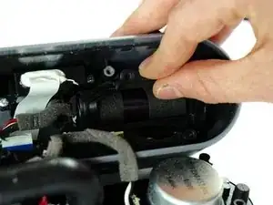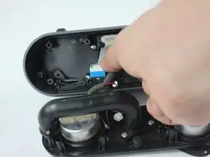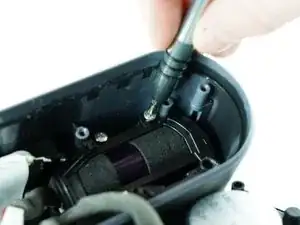 Отключите соединитель питания, показанный на изображении, используя пластиковый инструмент для открытия. Подденьте инструментом под кромку штекера; из‑за небольшой области и необычного угла подъём следует выполнять пластиковым инструментом в показанной конфигурации.