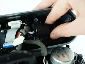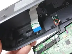 Будьте очень осторожны при снятии монтажной пластины динамика (описано на следующем шаге), так как к пластине подведены провода. Эти провода припаяны к пластине и к корпусу устройства. Провода гибкие, и вы по-прежнему сможете открыть устройство, как показано на втором снимке.