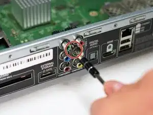 Открутите один винт длиной 80 мм с головкой T10 над портом HDMI с помощью отвёртки Torx.