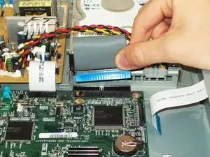 Отключите шлейф, соединяющий блок питания с материнской платой, потянув этот шлейф вверх.