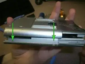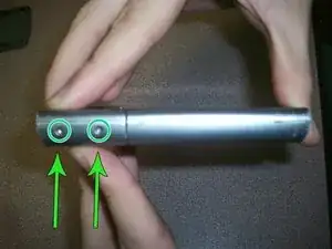 Стрелки указывают на два маленьких винта. С помощью крестовой отвертки удалите их.