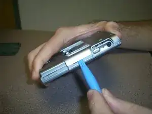 Чтобы открыть устройство, боковые панели нужно (с умеренной силой) поддеть инструментом для поддевания, как показано на фото.