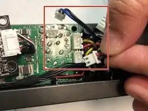 Теперь, когда звуковая панель откручена, осторожно поднимите материнскую плату и снимите провод, прикрепленный к ее нижней стороне. Для этого крепко захватите провода у основания (изображение 1) и потяните их прямо вверх.