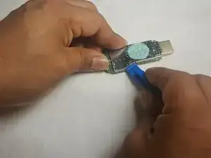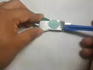 Вставьте пластиковый инструмент под угол и отожмите металлическую крышку от внутренних компонентов.