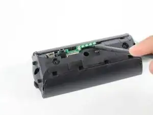 Начните с удаления резиновых заглушек с обеих сторон JBL Flip 2, используя чёрную лопатку, чтобы поддеть их в складках.
