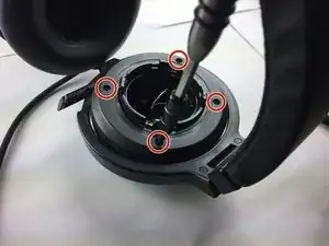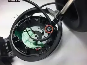 Вставьте пластиковый лопаток между динамиком и корпусом наушников непосредственно вровень с одной из открытых винтов корпуса, поскольку именно там находятся четыре защёлки, удерживающие динамик в корпусе. Эти защёлки становятся видимыми только после снятия динамика.