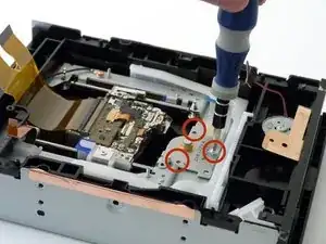 Теперь Вы видите внутренности оптического привода. Мотор закреплён тремя маленькими 5 мм серебристыми винтами. Удалите их.