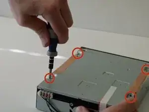 Удалите четыре 10 мм серебристых винта на нижней части оптического привода.
