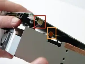 Перед откручиванием корпуса оптического привода необходимо отсоединить маленький кабель слева от привода (если смотреть со стороны задней панели) от платы (оранжевый кабель).