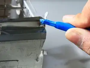 Используйте плоские пинцеты и пластиковый инструмент для открытия, чтобы снять верхнюю металлическую панель, поддев металлические язычки вверх, чтобы они смогли пройти через отверстия, и потяните вверх.