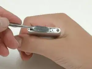 Осторожно вставьте инструмент для открытия iPod в шов между металлическим корпусом и белым пластиковым креплением.