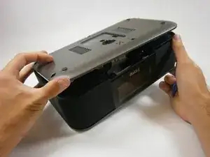 Как только зажим будет удален, держите нижнюю крышку открытой, чтобы зажим не вернулся на место. Остался один зажим; вы почти справились!