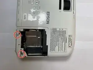 Используйте крестовую отвертку Phillips #1, чтобы выкрутить два винта 10,00 мм, которые удерживают боковую крышку проектора.