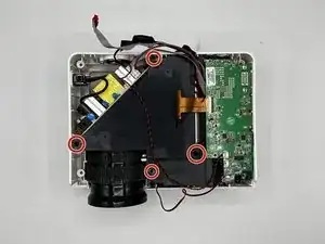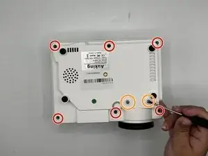 Удалите два винта длиной 14 мм с помощью отвертки Philips #1 на основании проектора.